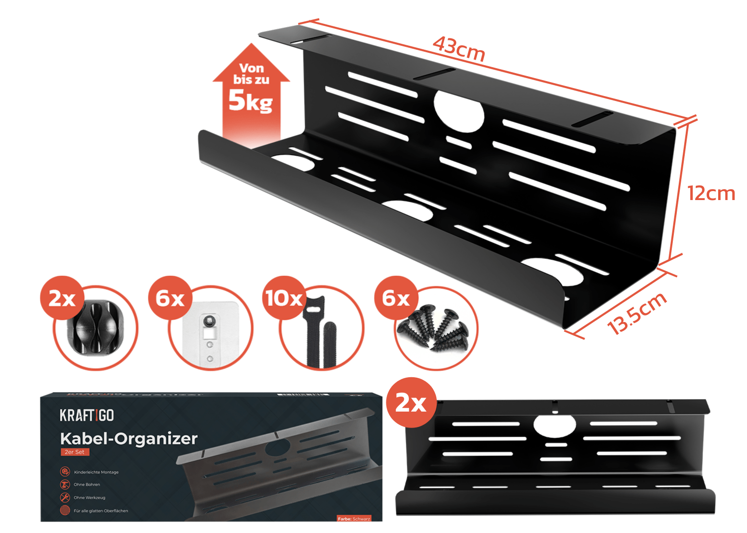 2× Kabelkanal (43×12×13,5 cm), 10× Kabelbinder, 2× Kabelhalter, Klebeschrauben & Schrauben – alles inklusive.